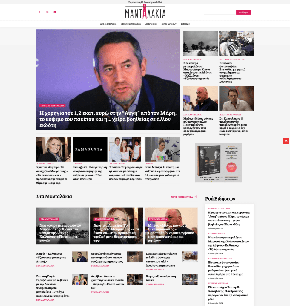 Aνακοινώνουμε ότι η εταιρεία μας ανέλαβε και ολοκλήρωσε την υλοποίηση του ειδησεογραφικού ιστότοπου https://www.mantalakia.gr/. Ο σκοπός του ιστοτόπου είναι να παρέχει έγκαιρη και έγκυρη πληροφόρηση στο αναγνωστικό κοινό με επαγγελματικό τρόπο.