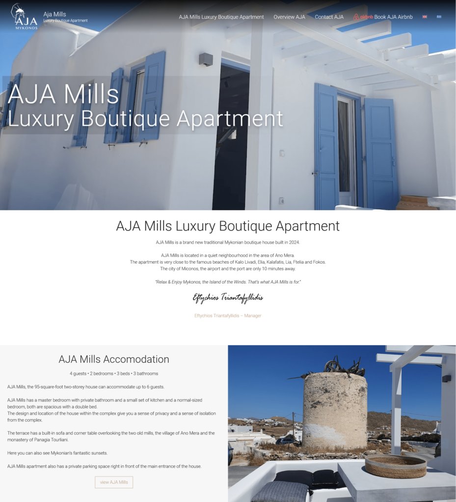 Η ομάδα της Econtent Systems δημιούργησε την εντυπωσιακή ιστοσελίδα του AJA Mills, σχεδιάζοντας έναν ψηφιακό χώρο που αποτυπώνει την παραδοσιακή αισθητική και το πνεύμα της Μυκόνου. Μέσα από το νέο site, μπορείτε να περιηγηθείτε στους χώρους της κατοικίας, να δείτε εκπληκτικές φωτογραφίες και να κλείσετε τη διαμονή σας με λίγα μόνο κλικ.