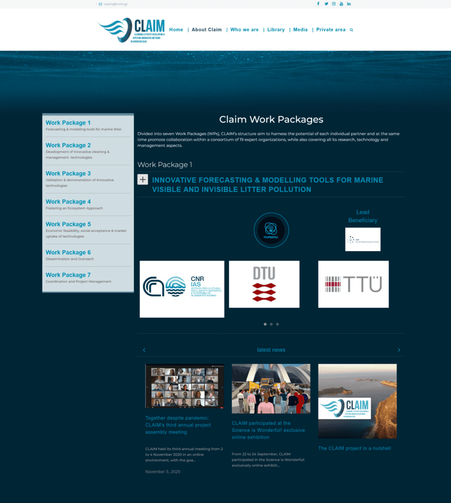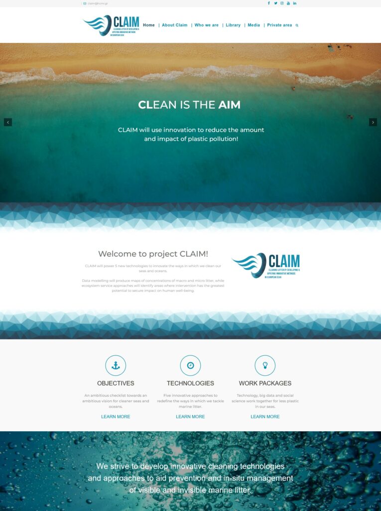 Η EContent Systems έχει αναλάβει τον σχεδιασμό και την υλοποίηση της επιστημονικής ιστοσελίδας του προγράμματος CLAIM (Cleaning marine Litter by developing and Applying Innovative Methods), η οποία διατίθεται στη διεύθυνση https://www.claim-h2020project.eu/. Το πρόγραμμα CLAIM είναι μια κορυφαία πρωτοβουλία που χρηματοδοτήθηκε πρόσφατα από το EU-HORIZON 2020 και αποσκοπεί στον περιορισμό της ρύπανσης στο θαλάσσιο περιβάλλον.