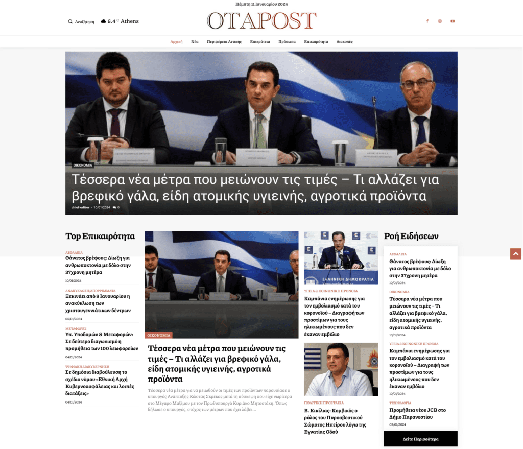 Υπερήφανοι για τη συνεργασία μας με το https://otapost.gr/! Ένα ειδησεογραφικό site που σχεδιάστηκε και υλοποιήθηκε από την ομάδα μας, προσφέροντας έγκαιρη και έγκυρη πληροφόρηση στο αναγνωστικό κοινό.