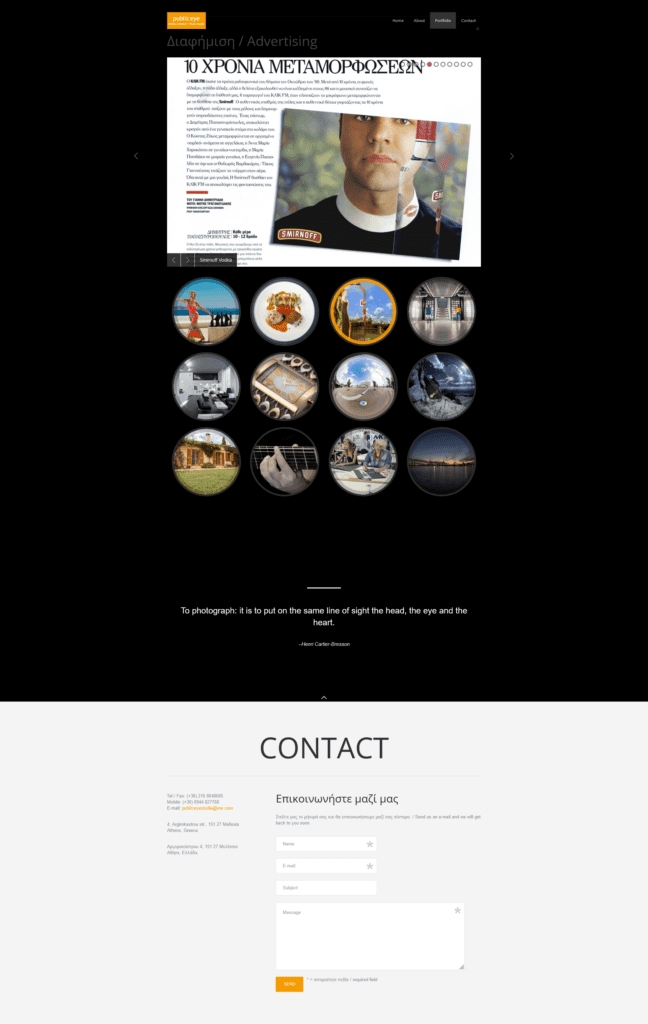 Η ομάδα της EContent Systems είναι υπερήφανη που ανέλαβε τη δημιουργία της επίσημης ιστοσελίδας του Studio Φωτογραφίας Public Eye. Το www.publiceye.gr αναδεικνύει την εξελιγμένη εκδοχή του στον ψηφιακό χώρο.